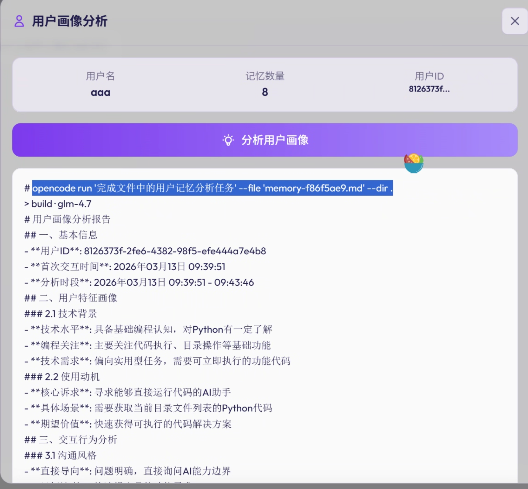 # opencode run ‘完成文件中的用户记忆分析任务’ –file ‘memory-f15e6047.md’ –dir .