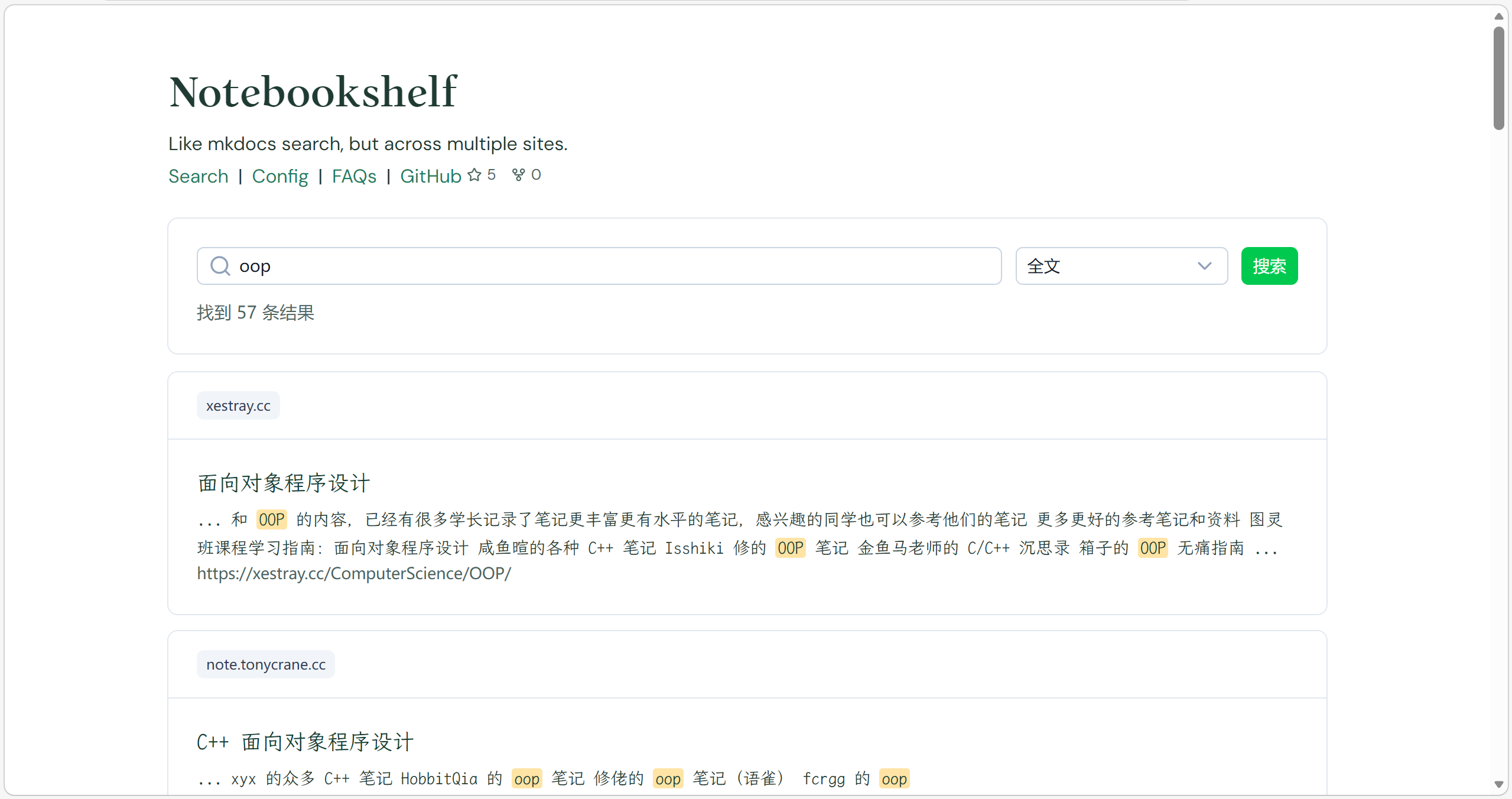 Find multiple mkdocs sites, and want to search something, but don’t want to search them one by one? Notebookshelf is here to help you. It can index multiple mkdocs sites, and provide a unified search interface for you to search across all the indexed sites.